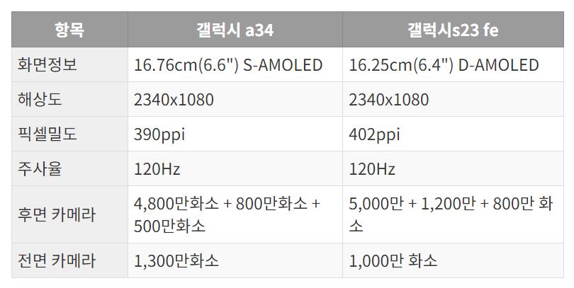 갤럭시S23FE A34 스펙 상세비교
